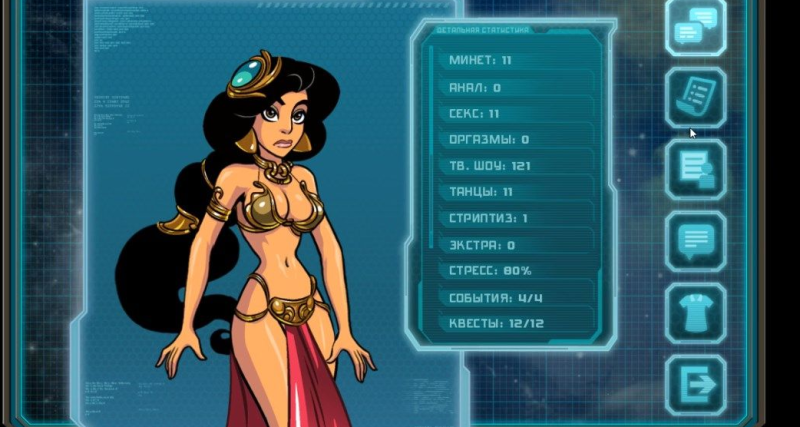 Звездный канал – хентай новелла, вновь знакомящая нас с хитрым Джином. Ранее мы встречались с ним в «Witch Trainer», и с тех пор герой совсем не изменился. Уже на старте вы встретите уйму интересных персонажей, взятых из разных вселенных. Гермиона, Жасмин, Эйприл, Лара Крофт – все они станут вашими верными подругами, готовыми последовать хоть на край света. Вкупе с тем вы окажетесь на борту космического корабля, напичканном уникальными технологами. Появится у вас и личная помощница Лора, готовая нарядиться ради капитана судна в любой костюм. Не понимаете, как пройти сложное задание или где найти нужную девушку? Советуем подключить к последнему эпизоду Star Channel 34 читы. С их помощью вы мгновенно получите много денег и кредитов, что откроет доступ ко всем возможностям. Пополняйте галерею порно картинками, открывайте эротические сцены и наслаждайтесь обилием пикантных моментов. Рассчитан проект лишь на совершеннолетних любителей porn новелл, интересующихся всем, что связано с Акабуром.Важнейшим достоинством игрушки выступает стильная рисовка. Также автора следует похвалить за интересный сюжет, напичканный отсылками и пасхалками. А еще имеются для season Star Channel 34 моды, благодаря которым вы мгновенно заполучите дополнительные задания. Ведите диалоги, отправляйте девушек на разные типы работ и зарабатывайте монетки, чтобы потратить их на эротические костюмы и аксессуары. Русификатор идет бонусом, а с элементами интерфейса разберется каждый, кому есть 18 лет. Давно хотели опробовать качественную порно новеллу? Тогда последний эпизод Звёздный Канал 34 на русском – это именно то, что вам нужно!